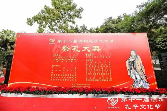 2020年12月19日上午10時(shí),由廣東高科技產(chǎn)業(yè)商會(huì)、廣東省藍(lán)態(tài)幸福文化公益基金會(huì)、三和國(guó)際集團(tuán)聯(lián)合主辦,孔圣堂,深圳市東湖公園,儒士社,慧善蕓雅公益慈善基金會(huì),深圳市詩(shī)書(shū)禮樂(lè)研究會(huì)和深圳市文化創(chuàng)意行業(yè)協(xié)會(huì)協(xié)辦的第十一屆深圳孔子文化節(jié)暨第十二屆祭孔大典,在東湖公園孔子文化廣場(chǎng)隆重舉行,原深圳市委副書(shū)記、深圳市深商總會(huì)會(huì)長(zhǎng)莊禮祥,三和國(guó)際集團(tuán)董事長(zhǎng)張華,中國(guó)電子電路行業(yè)協(xié)會(huì)名譽(yù)秘書(shū)長(zhǎng)、《三毛流浪記》中三毛扮演者、商會(huì)領(lǐng)袖王龍基分別代表政、商、學(xué)界致辭。